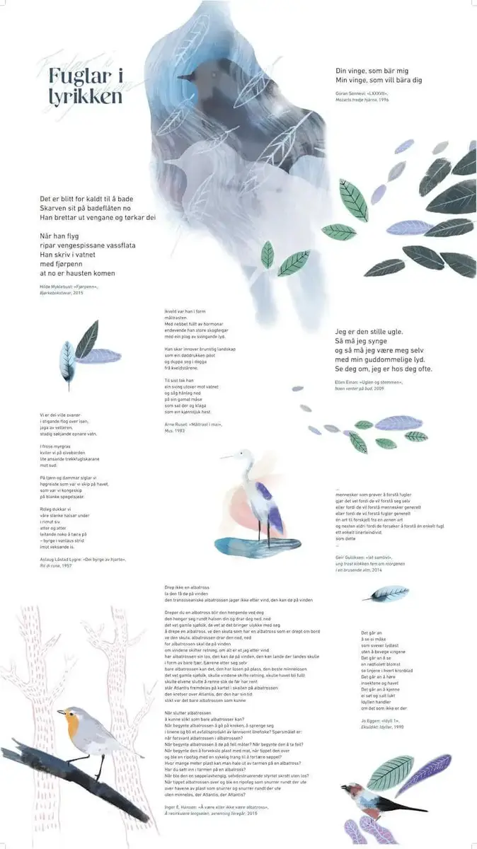 Utstillinga tek utgangspunkt i det nordiske når det gjeld dikt og fuglar, og vengespennvidda er stor. Her finst dikt for barn, songlyrikk, dikt om fantasi, og dikt som handlar om at menneskja si forureining øydelegg livsvilkåra for fuglar.