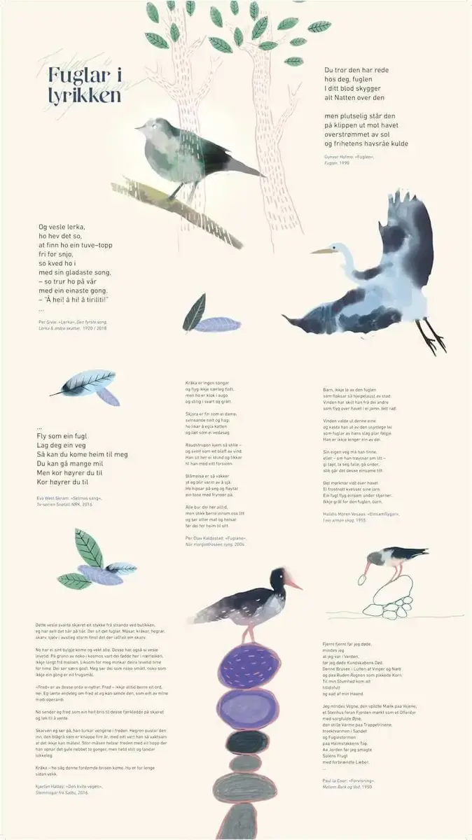 Når du opplever utstillinga kan du ha med deg nokre ord frå Olav H. Hauge om fellestrekk mellom dikt og fuglar, nemleg at det er ein «merkjeleg klang og musikk i dei»! Kanskje ser du nokre fuglar du kjenner frå før?